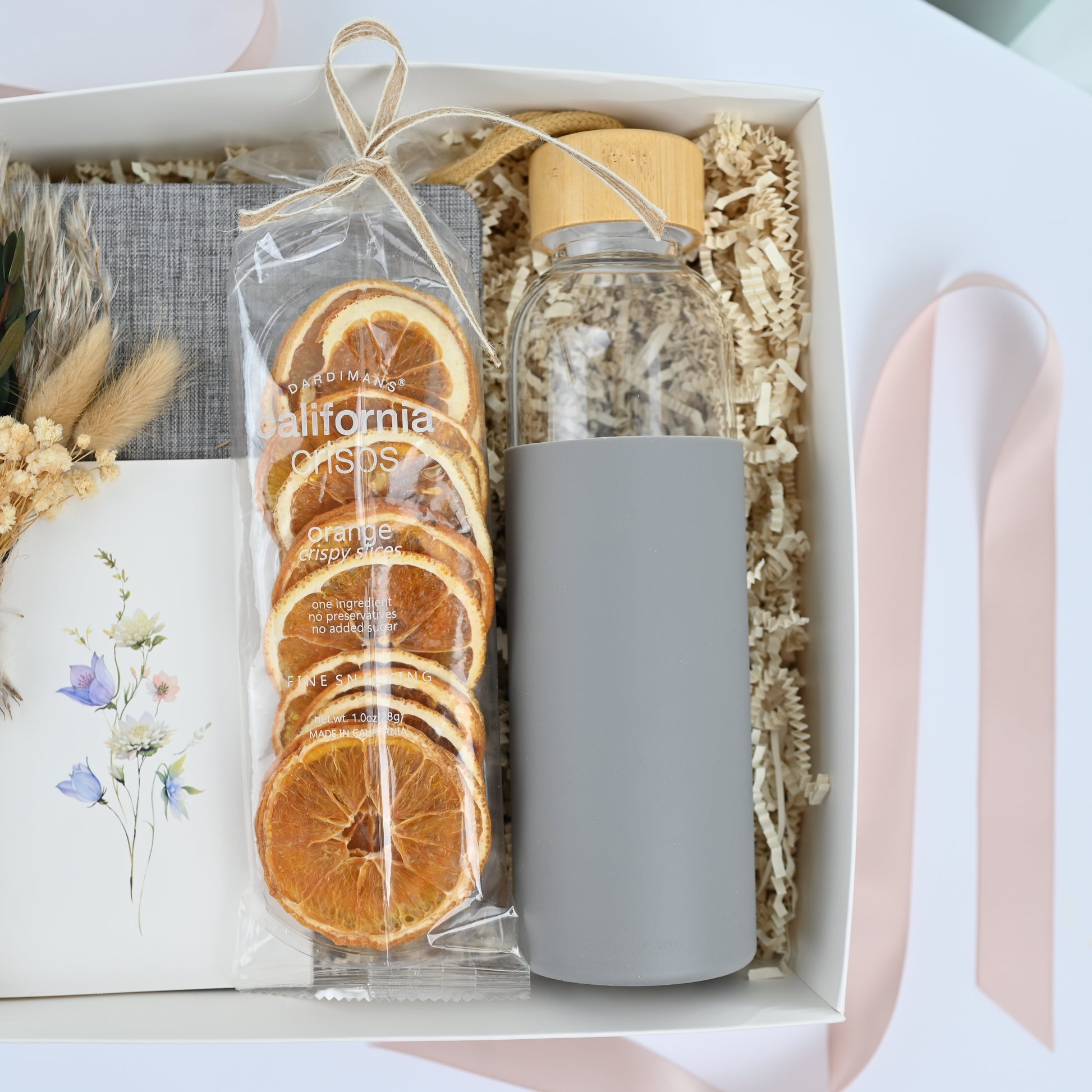 A modern and elegant gift box featuring a notebook, eco-friendly glass bottle, dried oranges, dried flowers, and a personalized greeting card. Optional Polaroid photo magnet (+$10) makes it even more unique. Perfect for thank you gifts, corporate appreciation, or any special occasion.